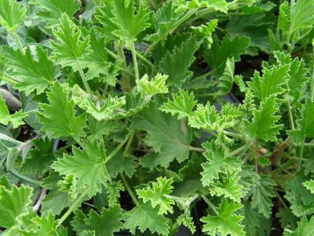 Jest to wyprostowany podkrzew o silnej dominacji pędu głównego. Oznacza to, że najczęściej z sadzonki uzyskamy pojedynczy badylek o znacznych nawet rozmiarach. Za młodu pęd jest lekko owłosiony. Również liście mają owłosienie. Włoski mają u podstawy gruczołki, stąd zapach kiedy poruszymy rośliną. Praktycznie to właśnie pięknie powcinane liście są główną ozdobą rośliny, jako że kwiatki zebrane w baldachy i wyrastające w kątach liści są drobne, mało efektowne, choć długo utrzymują się na roślinie.