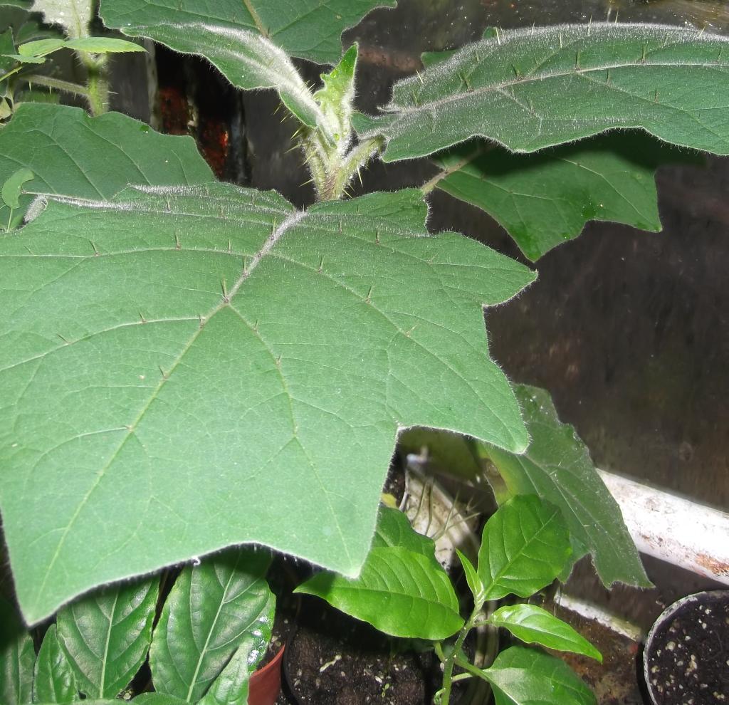 Liście: naprzemianległe, skórzaste, szerokoeliptyczne, o długości do 40 cm. Brzegi lekko ząbkowane lub klapowane. Ogonki liściowe i żyłki często pokryte czerwonawymi włoskami i kolcami.